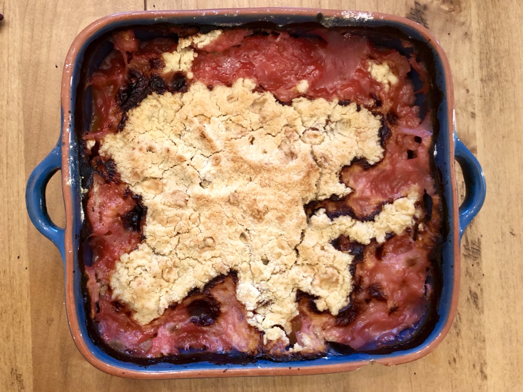 Don’t let this humble reputation fool you. There are so many possibilities of how to prepare rhubarb! Besides the popular pies, you can make rhubarb compote, lemonade, jam, & savory glazes for meats. You can bake muffins, cakes, & crumbles with rhubarb. This recipe is simply the easiest and quickest way to get rhubarb on the table. When I finally see rhubarb at the market, I load up my cart, head home, and have rhubarb for dessert that evening! The topping for this crumble is derived from the topping for my family’s famous apple pie. It is simply delicious.