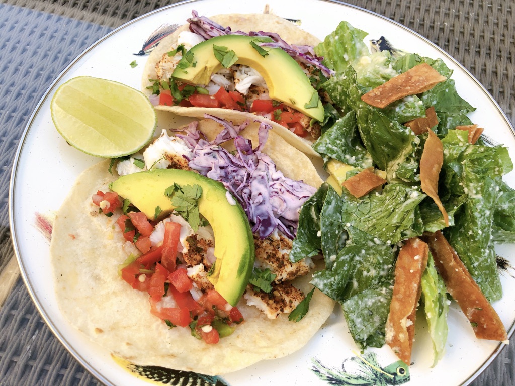 When Peter decided to make us Halibut Baja Tacos for our first wedding anniversary, I decided to focus all my cooking that night on the “side” salad, with a distinctly Mexican spin on the classic. You may not know this, but Caesar salad is actually Mexican to begin with. Legend has it that Italian-American restaurateur Caesar Cardini invented the salad in 1924 in Tijuana, Mexico. It has since been sensationalized and adopted across the globe to the point where many do not know the origin. Though the classic Caesar salad is Mexican, I pushed this recipe in a less traditional way by using bright local yogurt, lime, and avocado to compliment the Halibut Baja Tacos. Am I messing with history? Maybe / maybe not. But all I know is I got the big stamp of approval from my Caesar salad connoisseur of a husband.
